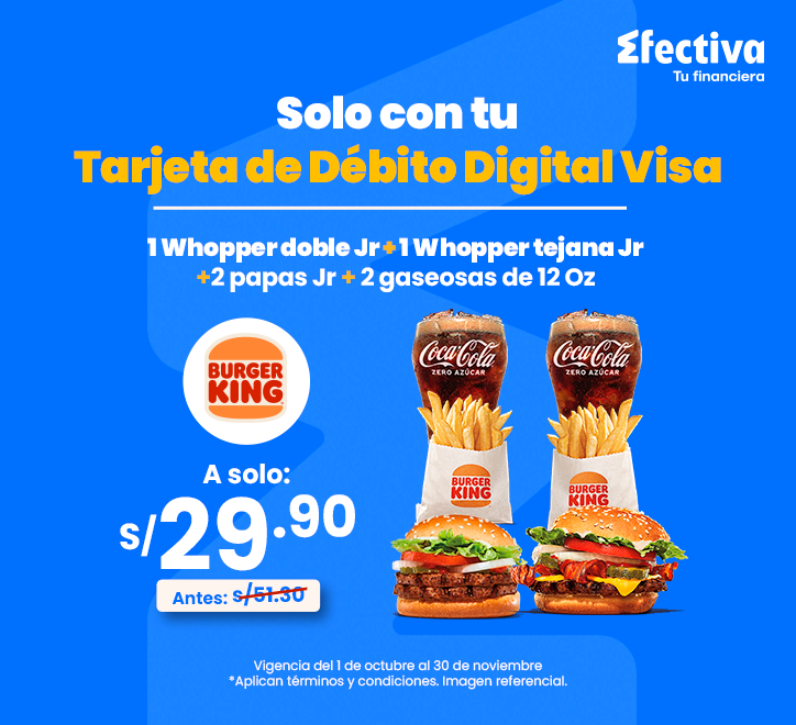 FINANCIERA EFECTIVA promueve y organiza la promoción denominada «Dúo Efectiva en Burger King a solo S/29.90” (en adelante, LA PROMOCIÓN), el cual tendrá validez a nivel nacional y entrará en vigencia del 01 de octubre al 30 de noviembre de 2025, sujeto al cumplimiento de los presentes Términos y Condiciones.