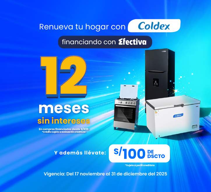 Condiciones generales del producto Electro: Vigencia del 17 de noviembre 2025 al 31 de diciembre 2025 o hasta agotar stock. Stock mínimo: 100 descuentos y 100 MSI a nivel nacional. Válido en tiendas EFE y La Curacao, excepto plataforma web. Las promociones no son acumulables ni transferibles. Aplica solo para compras de productos de la marca Coldex con crédito de Financiera Efectiva. Crédito sujeto a evaluación crediticia. El valor final de cuota y TCEA podría variar, en función a la evaluación crediticia, fecha de desembolso y facturación. TEA máxima hasta 113.16% vigente para el periodo de noviembre 2025 a abril 2026, conforme al tarifario difundido en la sección del producto y sujeta a actualizaciones semestrales establecidas por el BCRP. Las imágenes de los productos son referenciales. Financiera Efectiva no se responsabiliza por la idoneidad de los productos adquiridos mediante su crédito. Promoción 12 Meses Sin Intereses (12 MSI): Los 12 MSI aplican para compras desde S/899 en productos de la marca Coldex financiadas con crédito de Financiera Efectiva. El beneficio de meses sin intereses se otorgará únicamente si el cliente califica para el plazo antes mencionado. Promoción descuento: Llévate un descuento de S/ 100 por compras en productos de la marca Coldex con crédito de Financiera Efectiva, sin monto mínimo de compra. El beneficio del descuento se aplicará solo si el cliente califica según su perfil crediticio. Válido un (01) descuento por cliente. Ejemplo explicativo: Para un monto financiado de S/ 1,000 a 12 meses, la cuota mensual será de S/ 125.8 que incluye Seguro de Desgravamen sin devolución con una tasa mensual de 0.40%, total intereses S/ 480.07 y TCEA 122.95%, afecta al ITF 0.005%. Este ejemplo referencial fue elaborado considerando la contratación del Seguro de Desgravamen. Sin embargo, la contratación de dicho seguro es opcional para este tipo de crédito, conforme a la normativa vigente; por tanto, el cliente puede optar por no incluirlo en su préstamo. Además, el cliente puede elegir el Seguro de Desgravamen con devolución, con tasa mensual de 0.718% aplicable a créditos desde 24 meses. En cualquiera de los casos, tanto la TCEA como el valor de cuota podrían variar. Más información sobre el préstamo y sus condiciones en www.efectiva.com.pe o visita nuestras oficinas.