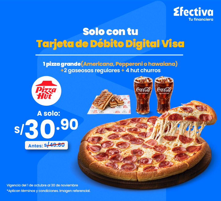 FINANCIERA EFECTIVA promueve y organiza la promoción denominada “PREGUNTA por tu combo EFECTIVA en PIZZA HUT a solo S/30.90” (en adelante, LA PROMOCIÓN), el cual tendrá validez a nivel nacional y entrará en vigencia del 01 de octubre al 30 de noviembre de 2025, sujeto al cumplimiento de los presentes Términos y Condiciones.