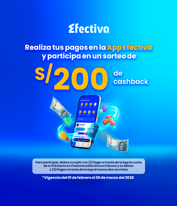 FINANCIERA EFECTIVA promueve y organiza el sorteo denominado ¡Realiza tus pagos en la App y participa en un sorteo de S/200 en cashback!” (En adelante, EL SORTEO) el cual tendrá validez a nivel nacional desde el 01 de febrero al 31 de marzo del 2026 y está sujeto al cumplimiento de los presentes Términos y Condiciones. La participación de los concursantes implica una aceptación integral de todas las condiciones del presente documento.