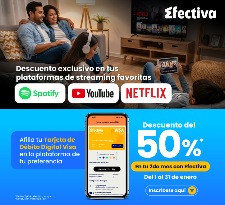 FINANCIERA EFECTIVA promueve y organiza la promoción denominada “Descuento: Obtén 50% descuento en tus apps de streaming favoritos” (en adelante, LA PROMOCIÓN), el cual tendrá validez a nivel nacional y entrará en vigencia del 01 al 31 de Enero del 2026, sujeto al cumplimiento de los presentes Términos y Condiciones.